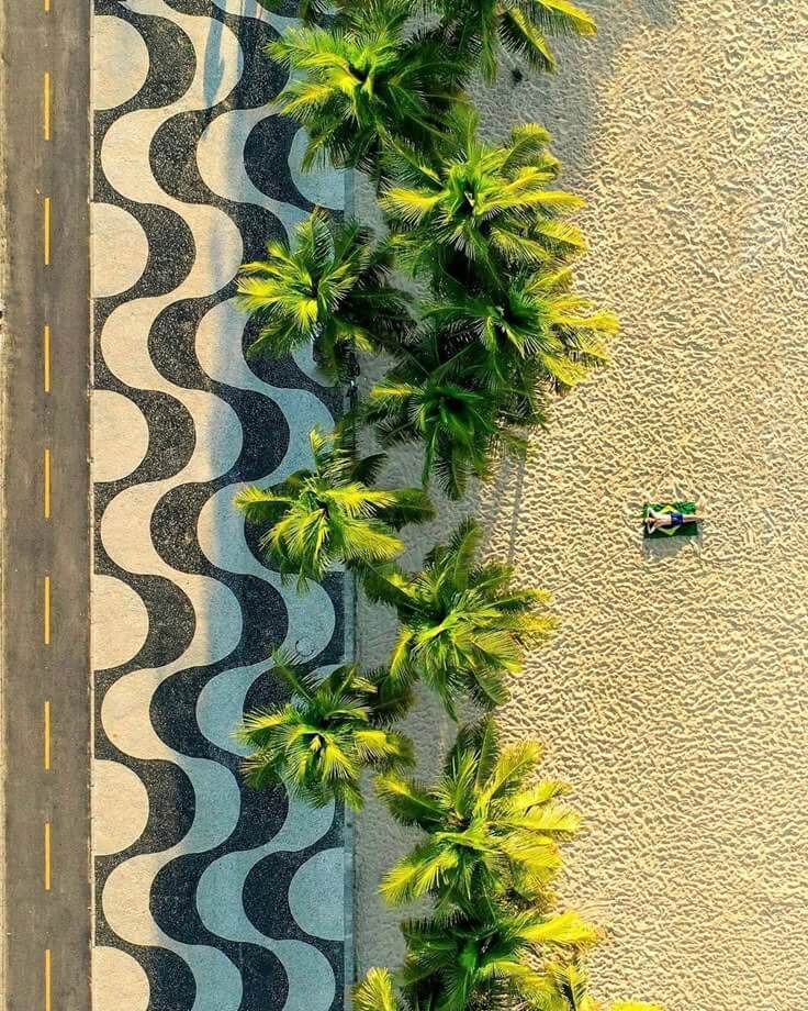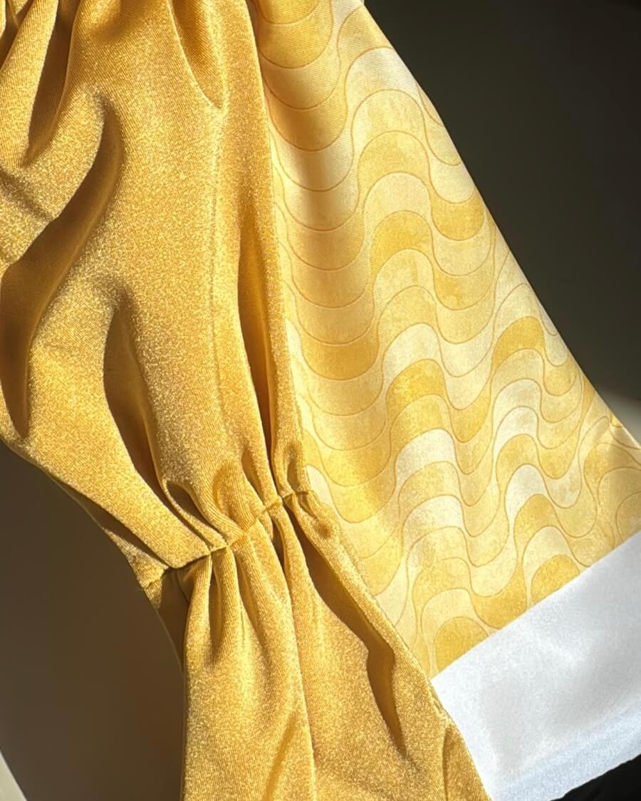 Each reversible piece plays with contrast: a glowing iridescent yellow on one side, and a wavy print echoing the curves of Copacabana’s legendary promenade on the other.