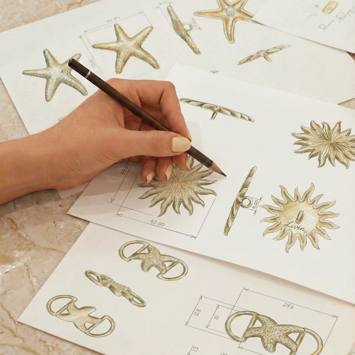Étoiles de mer serties de cristaux, anneaux sculptés en forme de soleil, coquillages martelés… Des détails façonnés avec précision, qui donnent naissance à des créations uniques, que l’on ne retrouve nulle part ailleurs.